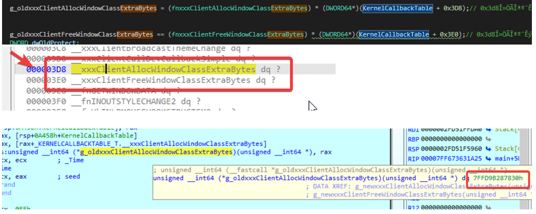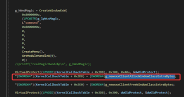 After that, it replaces the original xxxClientAllocWindowClassExtraBytes with the malicious version in the KernelCallbacktable.