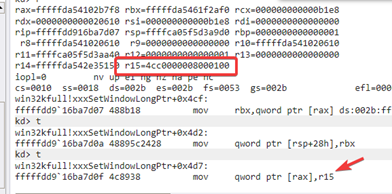 Now that the wnd0.cbwndextra field has been changed to a very large value (0xFFFFFFF), each time SetWindowLongPtr is called to wnd0, it will write to the adjacent wnd1 in kernel memory.