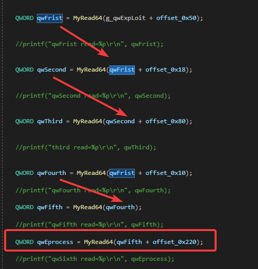 Chaining several reads from the leaked pointer from kernel leaks the EPROCESS value.