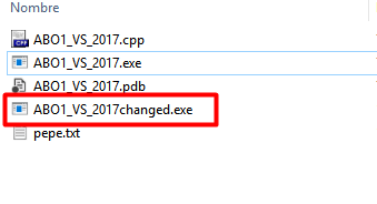 To test this, we made a series of changes in ABO1_VS_2017.exe and stored it as ABO1_VS_2017changed.exe. This second executable doesn’t work, but it’s useful for diffing and seeing the differences between both files: