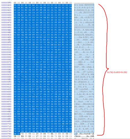 So the difference from the beginning of the section on disk of 0x400 to the file offset of 0x742 is 0x342. Now we add that 0x342 to 0x401000.