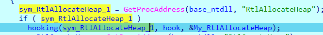 It calls a hooking function, which is the one that will perform the hooking of the RtlAllocateHeap API, which has three arguments, the first is the address of the API to be patched, called sym_RtlAllocateHeap.