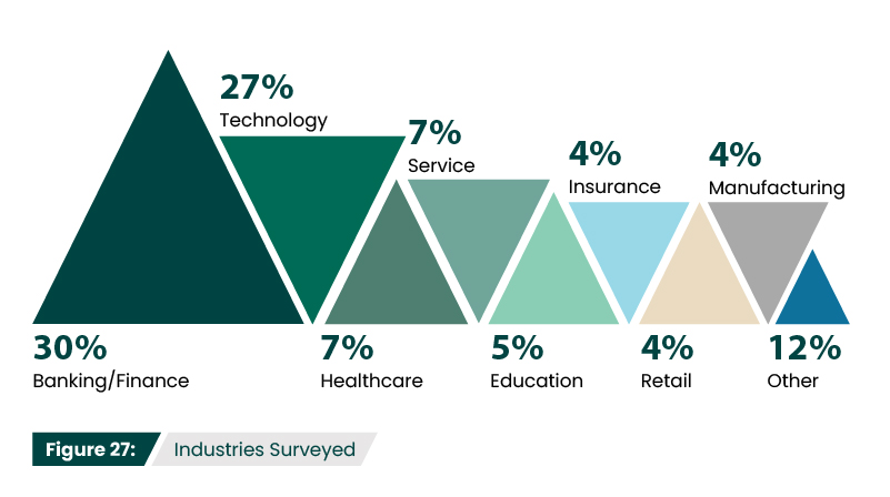 Web applications remain common environments for pen testing, but the 15% increase from last year is worth noting (Figure 24). It may reflect the increase in participants from the finance industry, whose web applications became an even more popular target last year (Figure 29). In fact, web application attacks were responsible for 77% of all breaches in the finance and insurance sector, according to the Verizon Data Breach Investigations Report (DBIR). Additionally, the DBIR found that 95% of attacks were financially motivated, making financial applications particularly tempting, as they can store bank account numbers, credit card details, Social Security numbers, and transaction history.