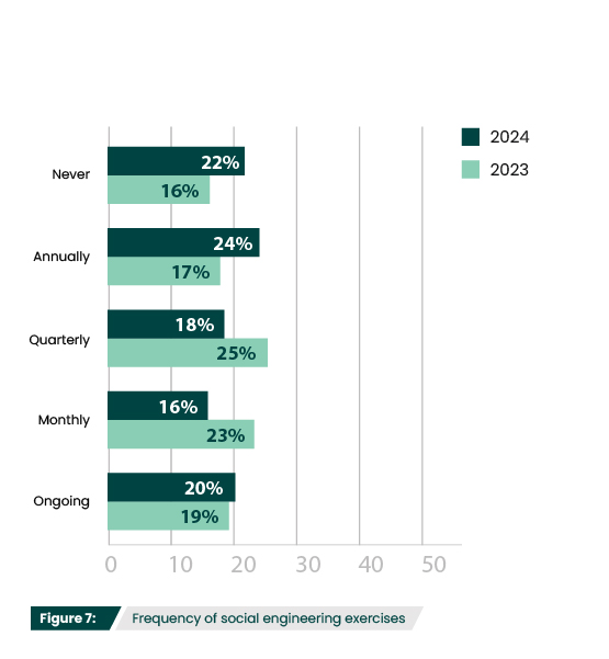 As phishing is more widespread than ever, it was disappointing to see a downward trend in the frequency of social engineering exercises. Quarterly exercises were down 7%, while there was a 6% increase in participants who never run these exercises (Figure 7). Though these aren’t huge shifts, given the prevalence of these attacks, social engineering exercises should only be on the rise.