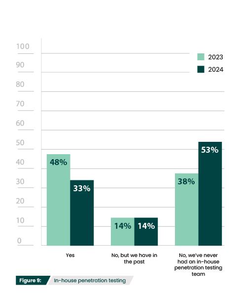 Having more general cybersecurity roles has been a common way for organizations to cope with the cybersecurity skills gap. The skills gap is also the second most common reason for not having an in-house pen testing team (39%) (Figure 10). According to (ISC)²’s 2023 Cybersecurity Workforce Study, the skills gap continues to widen, growing 12.6% from last year with a record high shortage of nearly four million.
